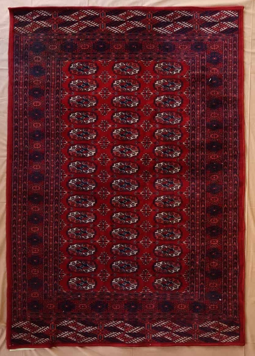 Der Teppich ist deutlich als handgeknüpft erkennbar, was sich insbesondere in der lebendigen Linienführung der Muster sowie in leichten Unregelmäßigkeiten äußert, die seinen Charme unterstreichen. Dennoch bleibt das Gesamtbild sehr präzise und sorgfältig ausgeführt. Zudem betont der feine Flor die Details der Zeichnung, während die dunklen Bordüren dem Teppich eine klare Begrenzung geben. Insgesamt bringt dieser alte Buchara handgeknüpfte Teppich den typischen Charakter zentralasiatischer Knüpftradition in Ihr Zuhause und setzt ein dekoratives, farbkräftiges Statement auf dem Boden.