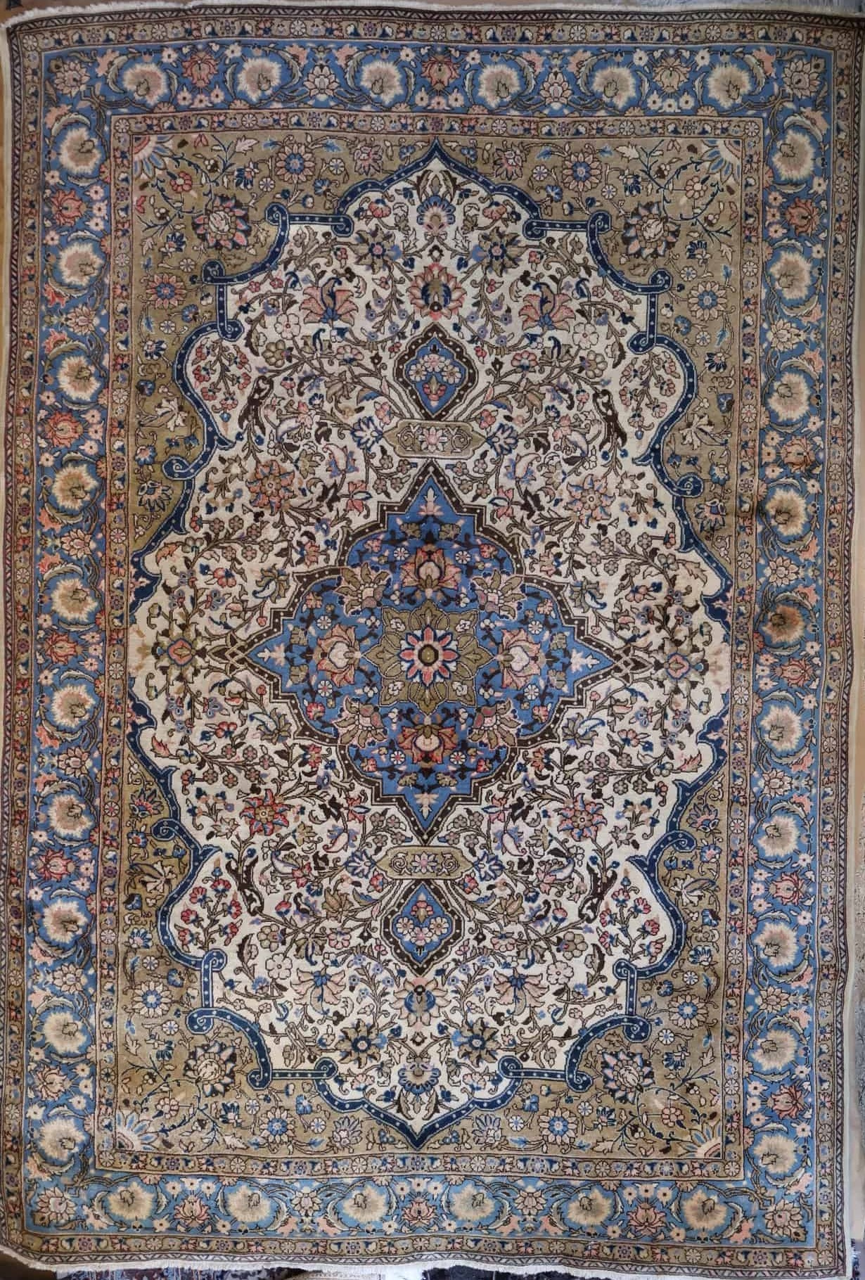Der Teppich zeigt ein klassisch persisches Medaillon-Design. Das große, vielstrahlige Mittelornament in Blau und Beige ist sternförmig aufgebaut und von kleineren, symmetrischen Kartuschen eingerahmt. Zudem ziehen sich filigrane Blumenranken über das gesamte Innenfeld und bilden ein dichtes, dekoratives Allover-Muster. Die Eckzwickel und geschwungenen Rahmen im Innenfeld sind in warmen Beige- und Olivtönen gehalten und setzen dadurch einen weichen Kontrast zum hellen Grund.