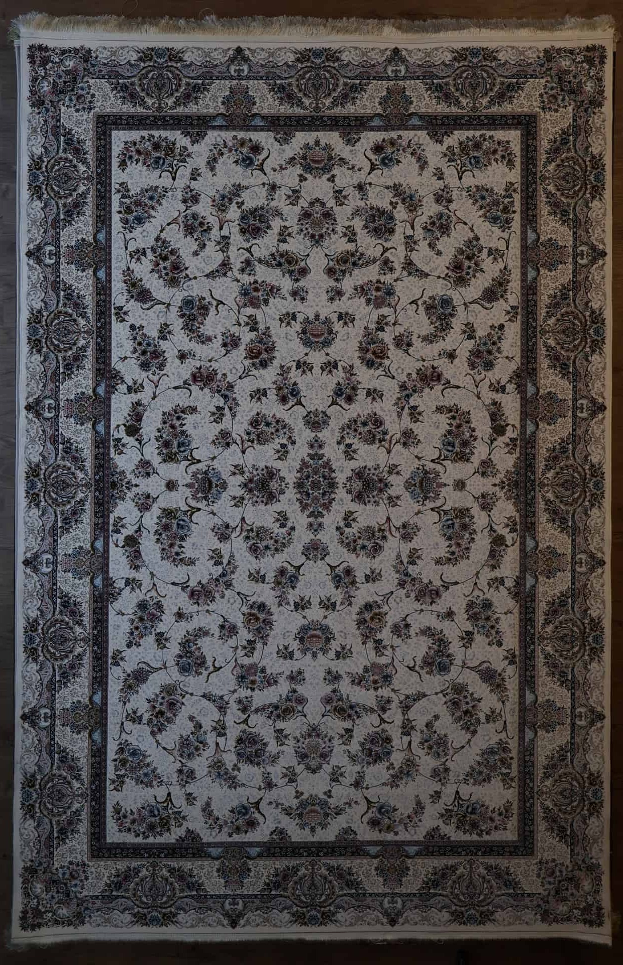 Dieser Persische Sarug Maschinenteppich präsentiert ein klassisches, florales Allover-Muster auf einem hellen, cremefarbenen Fond. Die feine Ornamentik mit stilisierten Ranken und Blüten verteilt sich gleichmäßig über die gesamte Teppichfläche und sorgt dadurch für eine sehr harmonische Wirkung. Zudem fallen die detailreich ausgearbeiteten Blumen in gedeckten Tönen wie Dunkelrot, Blau, Beige und Braun auf, die sich elegant vom Hintergrund abheben und dennoch ein stimmiges Gesamtbild erzeugen.